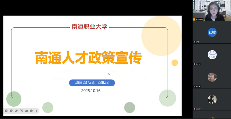 近日,南通市人力资源和社会保障局发布《南通人才新政4.0》,该政策构建了覆盖高校毕业生“求职—就业—安居—发展”全周期的支持体系,为青年人才在南通就业创业提供全方位保障。为积极响应地方人才战略部署,我院关工委牵头,组织专兼职辅导员同步召开“留通就业”主题班会,帮助毕业生精准理解政策内容、充分运用政策红利,引导其扎根南通实现职业发展。