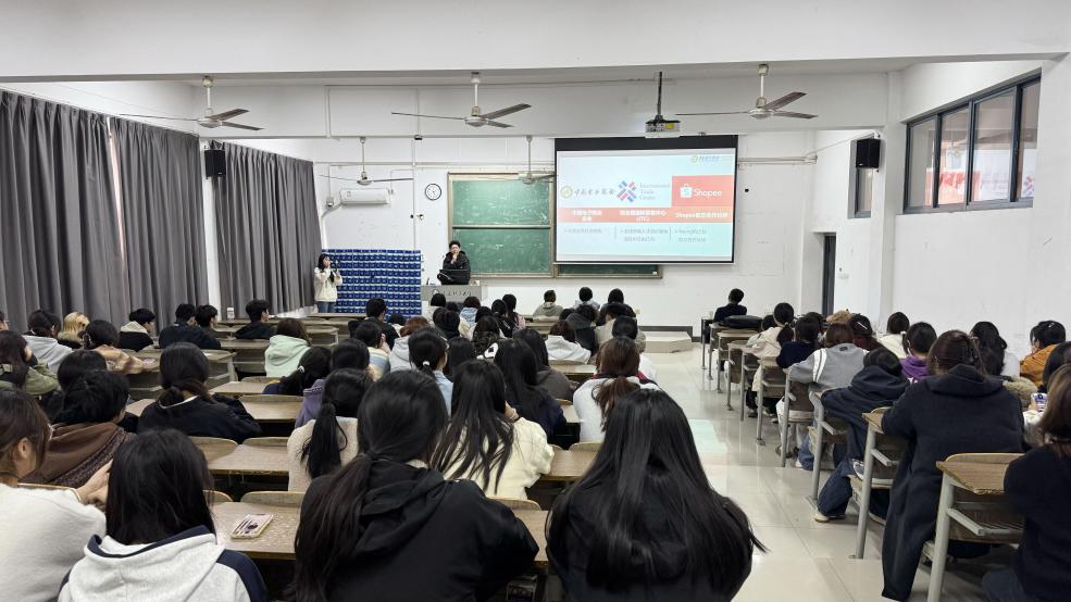 高老师还详细介绍了当前主流的跨境电商平台Shopee及其运营模式,并结合产业园自主研发的课程体系,展示了“理论+实训+项目”三位一体的教学模式。产业园已与多所院校建立深度合作关系,通过“课程共建、师资共享、项目共研”的方式,为学生提供真实项目实践机会,助力其从课堂走向职场。在培训成果展示环节,高老师分享了往期学员的成功案例,包括从零基础到独立运营店铺、从校园学生到跨境电商企业骨干的转变,激发了在场学生的浓厚兴趣。
