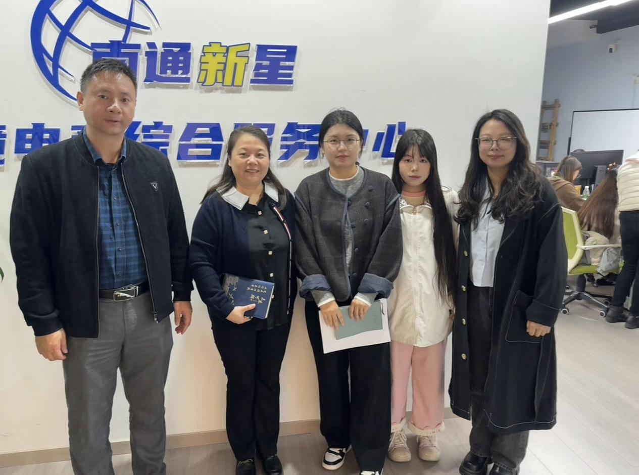 近日,我院党总支书记吴敬、党总支副书记顾锋一行赴南通新星跨境电商产业园走访调研,就深化校企合作、共建实习就业基地等事宜与园区主任李岩、总助刘海波深入交流,并亲切慰问了正在园区实习的2023级数字媒体技术专业学生。