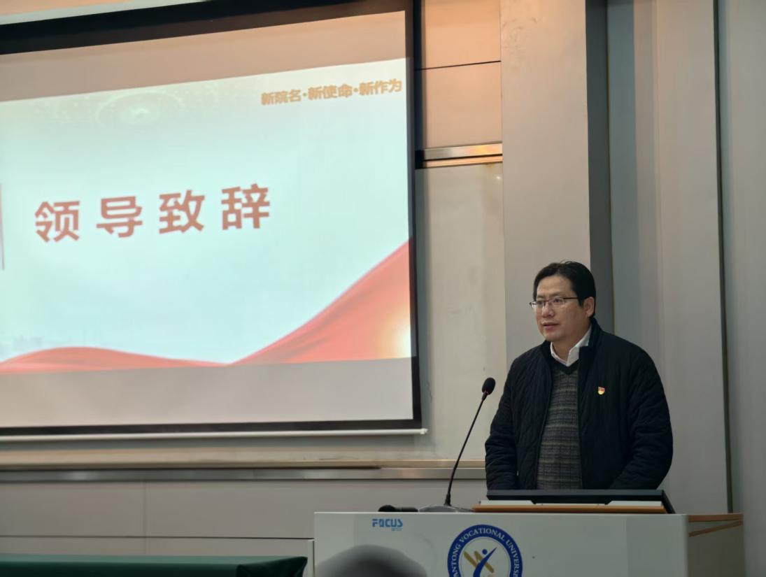 理论学习结束后,学院更名仪式在庄严的国歌声中拉开帷幕。校党委委员、副校长徐胜在仪式上致辞,他指出,学院更名是学校发展布局的重要举措,更是学院迈向高质量发展的新起点。他希望数字创意学院全体师生以此次更名为契机,坚守立德树人根本,筑牢育人根基;聚焦数字产业需求,强化专业建设;深化产教融合机制,提升实践能力;加强师资队伍建设,夯实发展支撑。乘势而上、锐意进取,在新的征程上实现更高质量的发展。