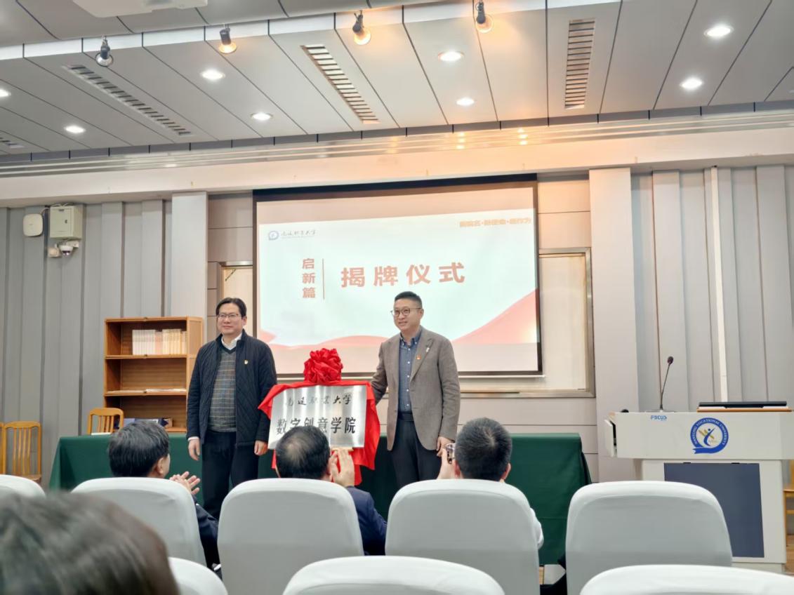 随后,在全场期待中,徐校长与江院长共同为“数字创意学院”揭牌,红绸落下,全场掌声雷动。