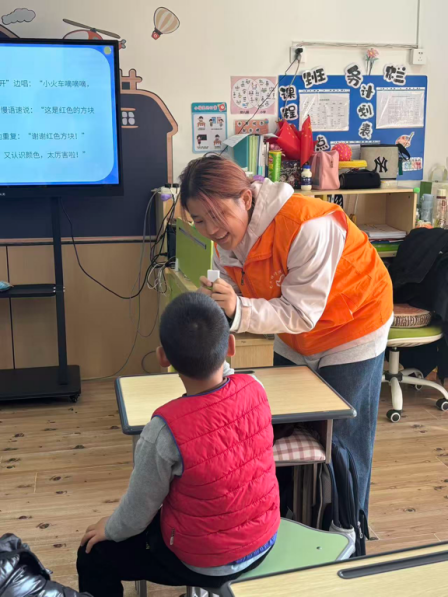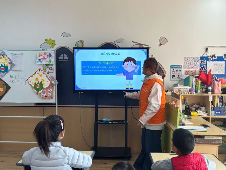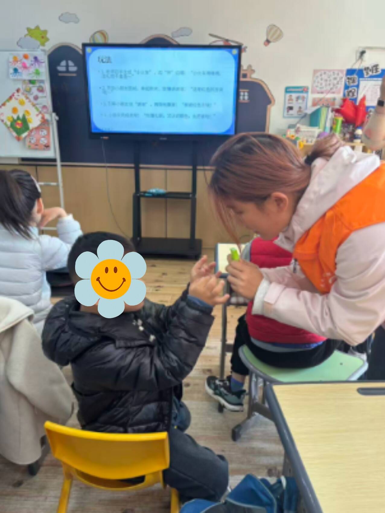 活动中,志愿者们化身“全能老师”,以亲切的自我介绍迅速拉近与孩子们的距离。随后,借助大屏幕课件,通过“看图猜对错”等互动形式生动讲解社交规则,课堂气氛热烈,孩子们踊跃举手参与。游戏环节前,志愿者现场示范“小手举高高”的玩法,用夸张有趣的动作引发阵阵欢笑。此外,还借助彩色方块教孩子们辨识颜色、学习礼貌用语,并耐心引导每位孩子积极参与,确保活动寓教于乐、温暖有序。