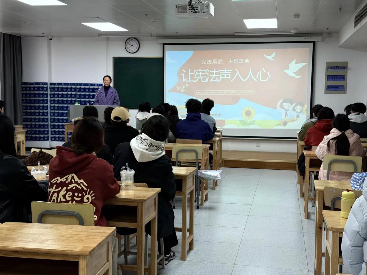 12月4日上午,学院组织学生集中观看教育部全国青少年普法网“宪法晨读”直播,与北京主会场、南京分会场同步诵读宪法条文。直播间内,同学们精神饱满、声音洪亮,在庄重的氛围中感悟宪法权威、领会法治精神。此外,学院结合专业特色,通过一站式学生社区、主题班会等平台,开展了宪法知识普及、宪法主题创意设计等丰富多彩的配套活动,让同学们在沉浸式体验中深化对宪法的理解与认同。