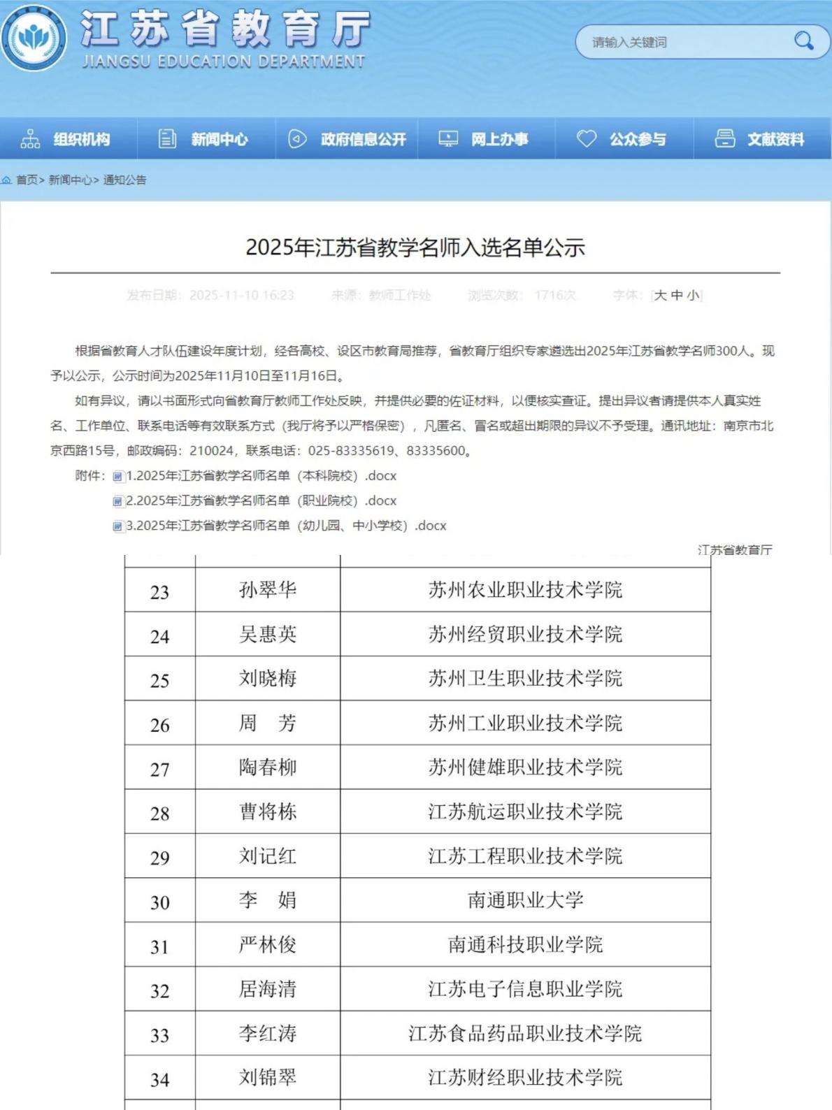 近日,江苏省教育厅正式公示“2025年江苏省教学名师”入选名单,我院李娟老师凭借在教学改革、课程建设、文化传承等领域的突出贡献位列其中。这份荣誉不仅是对她深耕职教领域多年的高度认可,更彰显了我院在艺术设计专业人才培养与地方文化服务中的标杆地位。