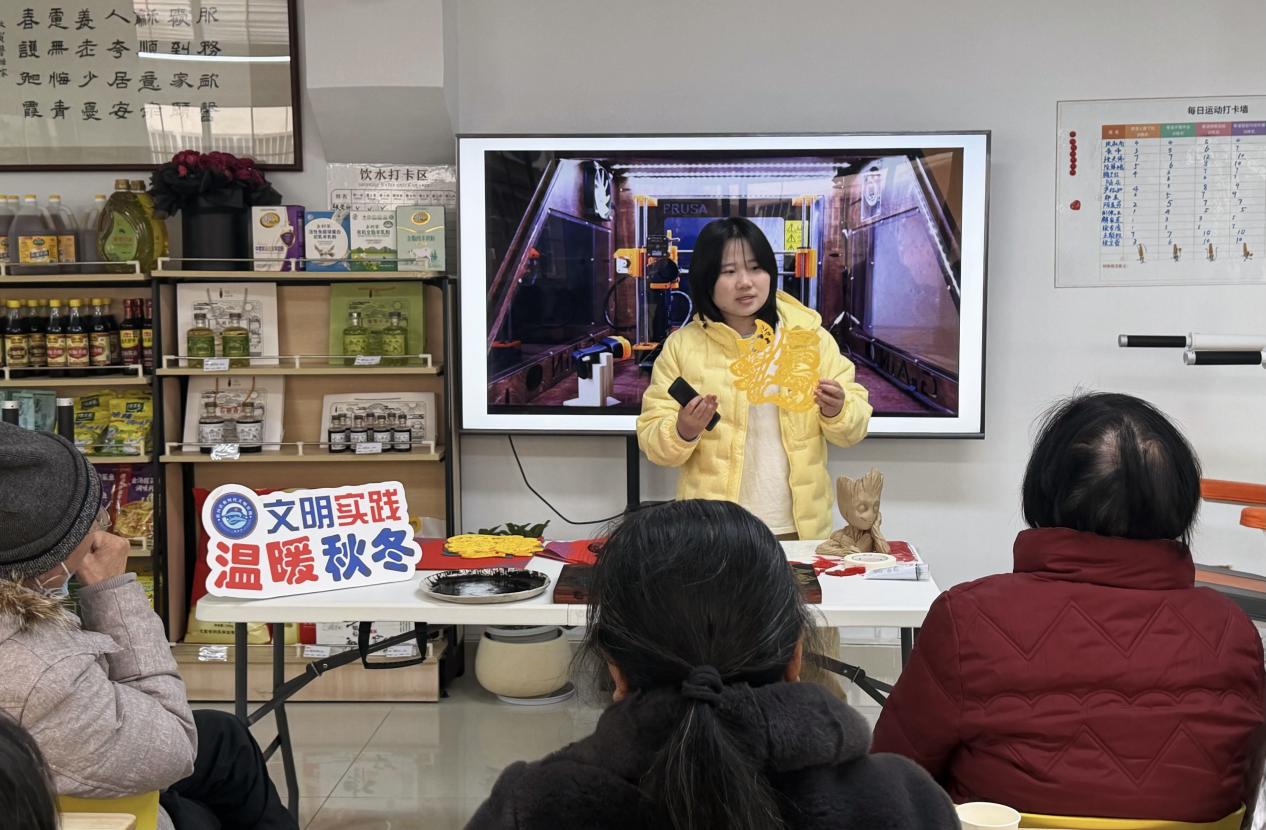 12月30日上午,我院教师刘琛带领创想3D打印社团学生走进南通市紫荆花社区日间照料站,开展“智印新岁·福暖银龄——紫荆花社区迎新年拓印敬老活动”,以艺术设计与数字技术融合的方式,为社区老年居民送上新年文化体验。