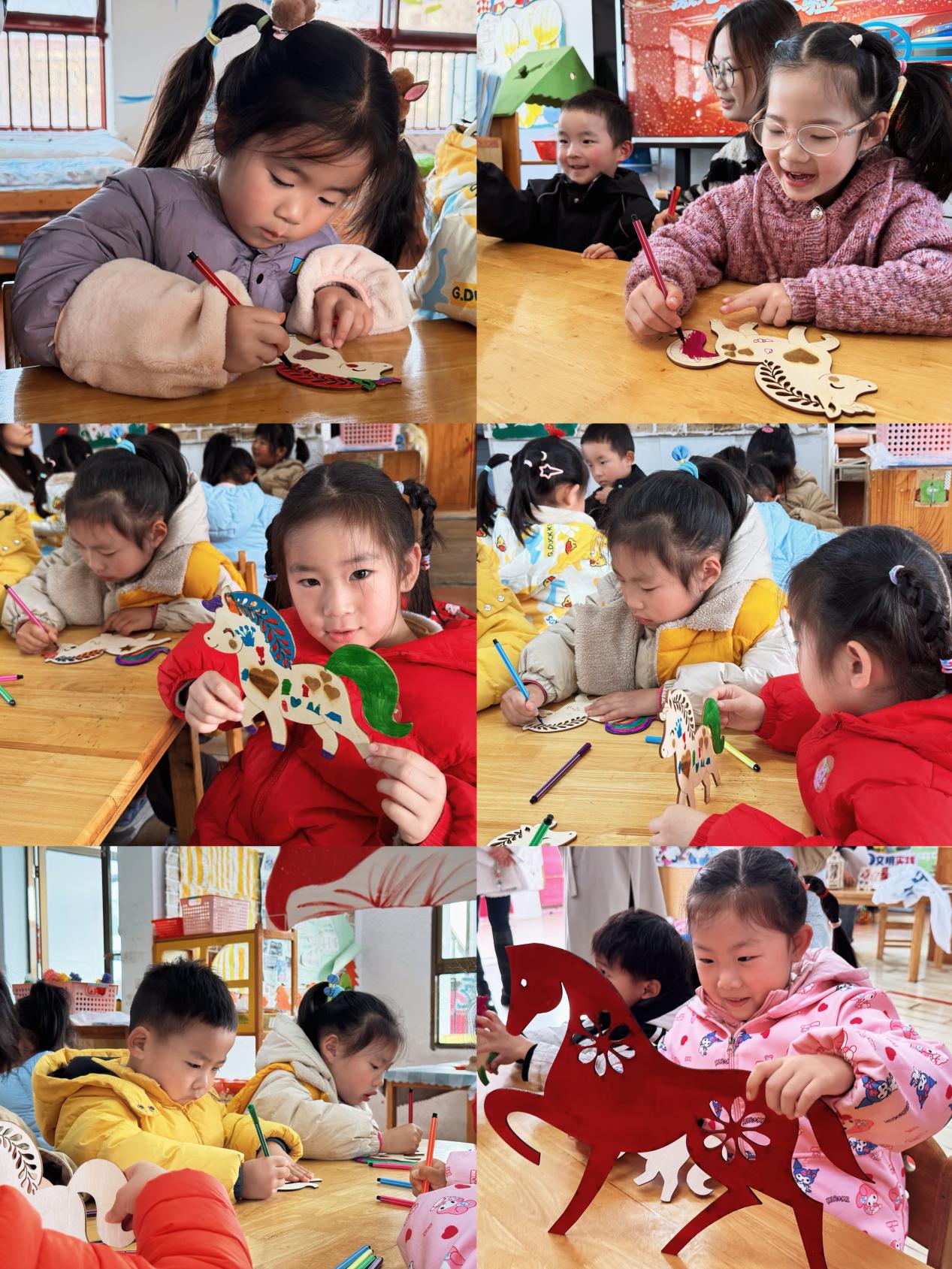 随后,进入实践创作环节。孩子们以师生基于数字技术进行原创设计的马年主题椴木马造型为创作载体,自由进行涂色与装饰。这些造型以传统生肖文化为主题,结合简洁、符合幼儿认知特点的现代造型设计,为幼儿提供了开放、多元的艺术表达空间。孩子们在创作过程中大胆用色、自由发挥,将想象与情绪融入作品之中,充分体验动手创作带来的乐趣。