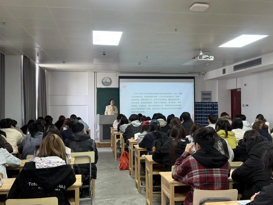结合课前开展的大学生手机使用情况专项调研,孟老师用真实数据直观展示了当前学生学习状态与时间使用情况,清晰呈现自我管理、课堂专注、时间分配等方面的突出问题,让同学们直面现状、正视不足,为精准推进学风建设提供现实依据。